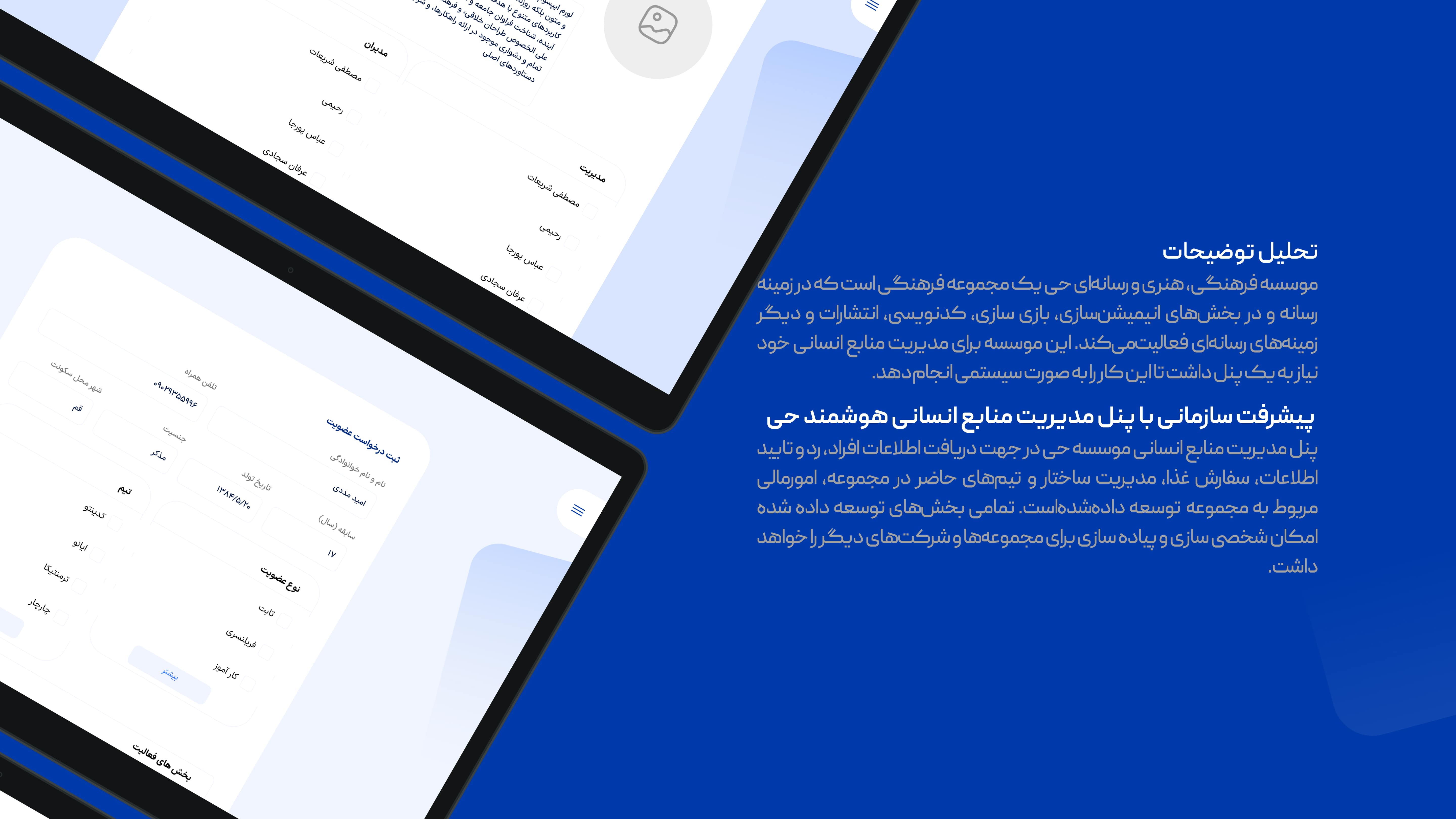 موسسه فرهنگی، هنری و رسانهای حی یک مجموعه فرهنگی است که در زمینه رسانه و در بخشهای انیمیشنسازی، بازی سازی، کدنویسی، انتشارات و دیگر زمینههای رسانهای فعالیتمیکند. این موسسه برای مدیریت منابع انسانی خود نیاز به یک پنل داشت تا این کار را به صورت سیستمی انجام دهد. پیشرفت سازمانی با پنل مدیریت منابع انسانی هوشمند حی : پنل مدیریت منابع انسانی موسسه حی در جهت دریافت اطلاعات افراد، رد و تایید اطلاعات، سفارش غذا، مدیریت ساختار و تیمهای حاضر در مجموعه، امورمالی مربوط به مجموعه توسعه دادهشدهاست. تمامی بخشهای توسعه داده شده امکان شخصی سازی و پیاده سازی برای مجموعهها و شرکتهای دیگر را خواهد داشت.